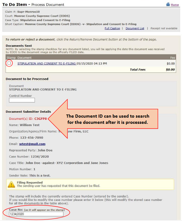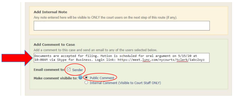 Add Internal Note is not applicable for EDDS submissions and should be left blank. Add Comment to Case is an optional field used only to add comments to email sent to the document submitter when the document is processed [see How to Submit Documents via EDDS - Step 11-A: Email Confirming Acceptance and/or Filing of Documents]. If a comment is entered, leave the Email Comment to Sender box checked and the Public Comment radio button selected. (The Internal Comment radio button is not used for EDDS submissions and should not be selected.) Comments for processed documents may include confirmation that the document was processed and accepted for filing and/or additional information and instructions regarding further court proceedings [see example below]. Proceed to Step 7-B: To-Do Item – Process Document (process all documents). NOTE: Comments for documents that are returned are not entered here. They are entered on the Return Document screen [see Step 8-B: Return Document]