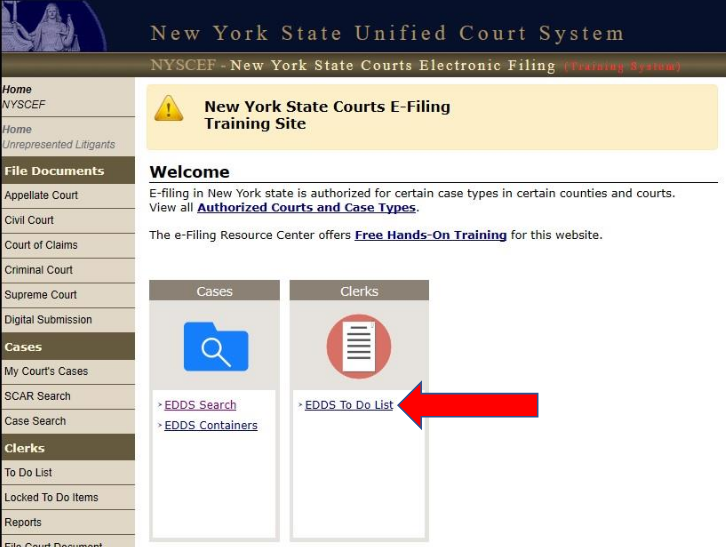 Click the EDDS To-Do List link in the Clerks menu