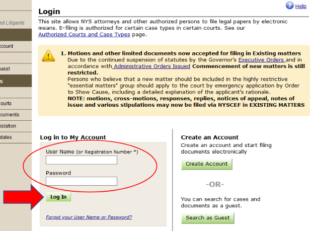 On the NYSCEF Login page, enter your User Name and Password and click the Login button.