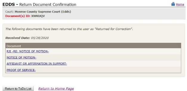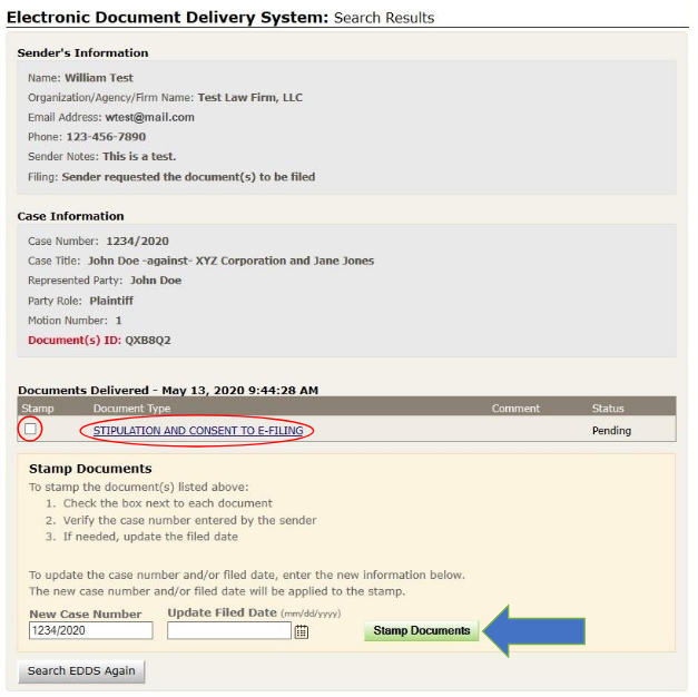 Unlike e-filing, document submission via EDDS does not constitute filing, but you can request that your document is accepted for filing by checking the Filing box on the Enter Your Information screen [read How to Submit Documents via EDDS - Step 3: Enter Your Information]. After reviewing the document, the Court or County Clerk, as applicable, determines if the document meets established filing requirements and is suitable for filing, and you will get an email notifying you of whether your document is accepted for filing or not [read How to Submit Documents via EDDS - Step 11-A: Email Confirming Acceptance and/or Filing of Documents and Step 11-B: Email Returning Documents for Correction].