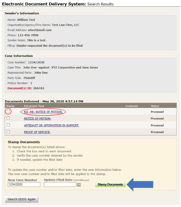 To view a document, click the document name link (e.g., NOTICE OF MOTION, AFFIRMATION/AFFIDAVIT OF SERVICE, STIPULATION, etc.) in the Document Type column, and the PDF document opens in a new browser window. If a filed stamp was not already applied on the Process Document page [see How to Review Documents Submitted via EDDS, Step 6: To-Do Item (review documents)], you may check the Stamp box and click the Stamp Documents button to apply a file stamp to a document if desired.