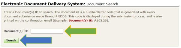 Enter the Document ID [see How to Review Documents Submitted via EDDS, Step 6: To-Do Item (review documents)]. Click the Search button.