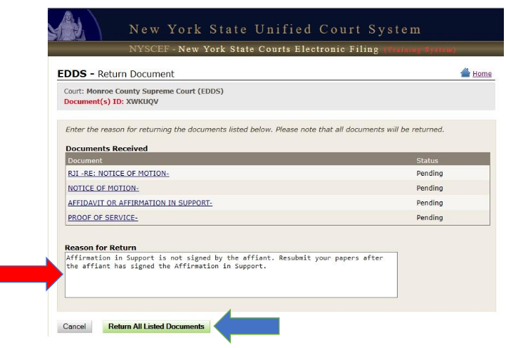 Enter a reason why the documents are being returned in the Reason for Return field, which is included in the automated email sent to the document submitter [see How to Submit Documents via EDDS - Step 11-B: Email Returning Documents for Correction]. Click the Return All Listed Documents button. Proceed to Step 8-C: Return Document Confirmation.