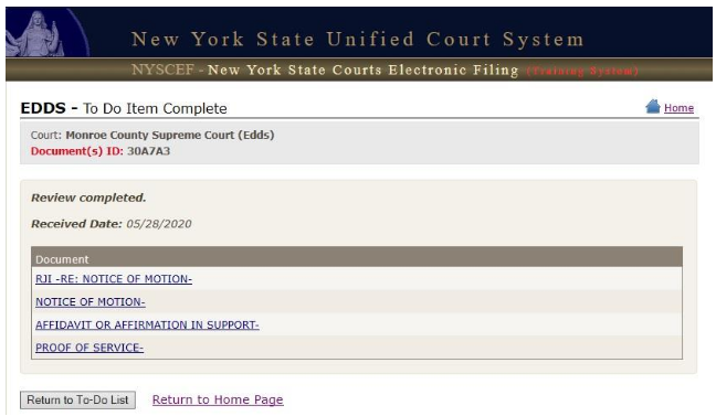 After the document is processed, confirmation displays on the To-Do Item Complete screen. Document processing is now complete.