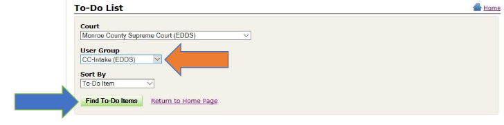 Select the applicable user group in the User Group drop-down list. [NOTE: Most Supreme courts have only one user group called Intake (EDDS).] Click the Find To-Do Items button to display a list of submissions to the court via EDDS.