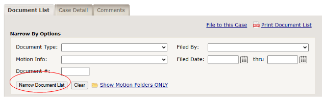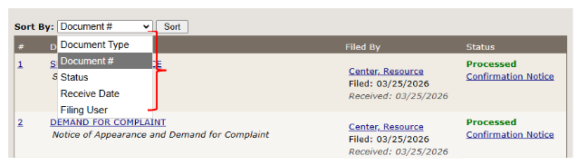 The "Document List" tab shows all the documents that have been filed into the case you are viewing. You can sort the Document List by the following categories: