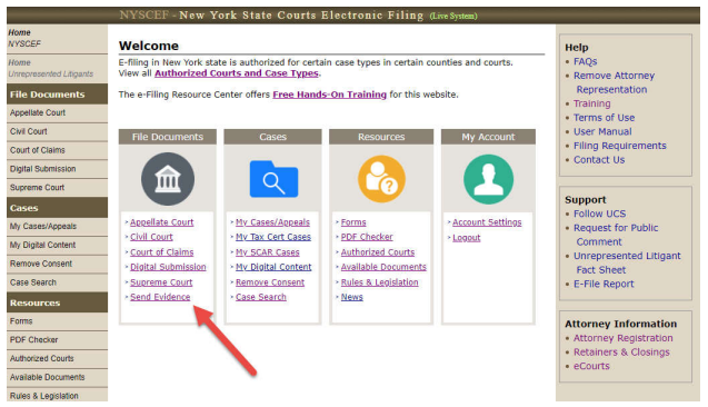 Once you receive the e-mail notification you will be able to submit your evidence documents. To begin, log into your account in NYSCEF. On the welcome page select the "Send Evidence" link located under the File Documents column. (see below screenshot)