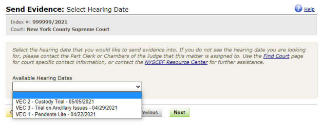 After clicking the Send Evidence link, you will be prompted to enter the index number of your case and to select the court.