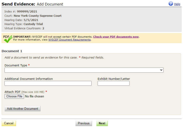 Once you select the correct Virtual Evidence Courtroom you will be brought to the document upload page where you will be able to