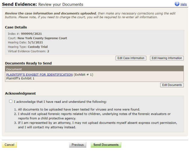 Next, review and check the filing acknowledgment box and click send documents to submit your evidence. An email confirmation will be