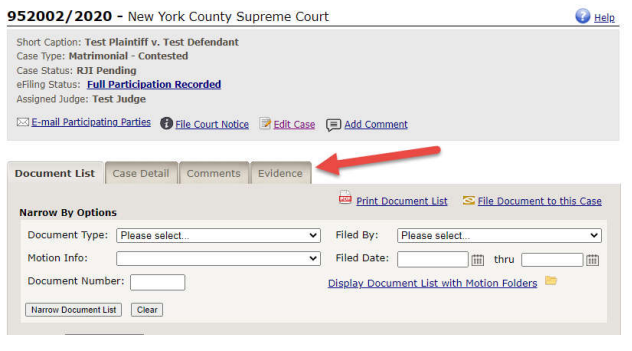 NYSCEF document list you will see multiple tabs at the top of the page. Click on the Evidence tab.