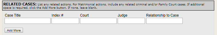 Once you have entered all plaintiffs or petitioners exactly as they appear on your commencement document, use the scroll bar to scroll down the page and enter defendants or respondents by typing the names of each in the proper fields as you did for plaintiffs/petitioners. The screen allows you to enter up to five defendants/respondents. If your case has more than five, click the Add More Defendants/Respondents button at the bottom of that box.