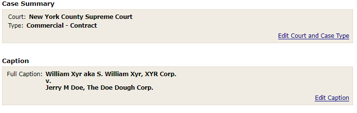 Review each party in the caption to be sure that the caption you have entered matches the caption on your commencement document. The Compare Caption box, shown below, provides four ways to edit your caption.
