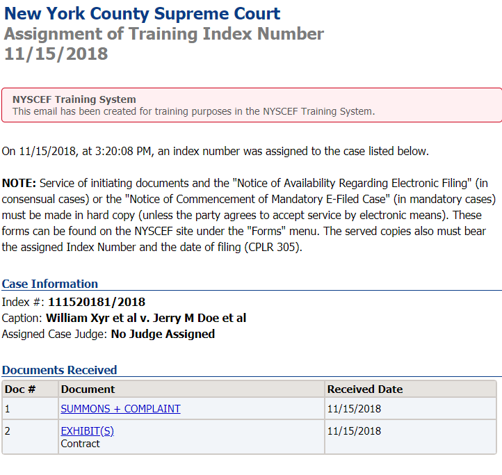 NYSCEF also makes available the "Training System." The Training System mimics the Live System in function and appearance, but no real