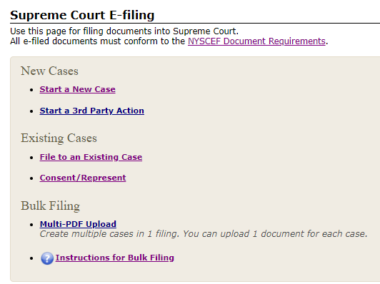 You will arrive at the NYSCEF Login page. If you are ready to start an action, file to an existing case, or record your representation,