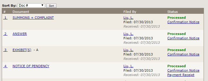 The document list shows the document number, document type, the status of the document, the received date, and the filing user. To view an image of any document appearing on the list, simply click on the document name, such as "SUMMONS + COMPLAINT", and an image of the document will open. However, if the document has been returned for correction, you will not be able to view an image of the document. In addition, links in the far right column allow you to access the Confirmation Notice generated by NYSCEF upon the filing of that document and, if the document was a fee document, the receipt generated by NYSCEF upon the payment of that fee. -