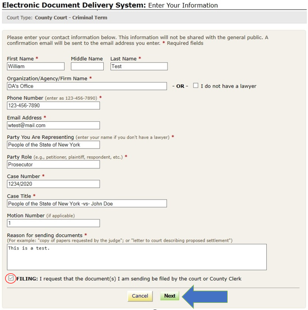 Enter your name and contact information, case information, and briefly explain why you are submitting the document(s). You must complete all fields marked with an asterisk (*). You can enter "Not Applicable" in the Case Number field if a case number has not been assigned yet. Check the Filing box if you want the document(s) filed by the court or County Clerk, as applicable. Click the Next button to continue.