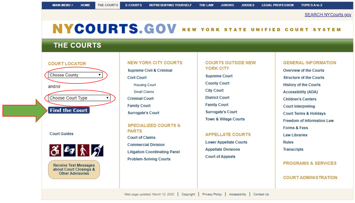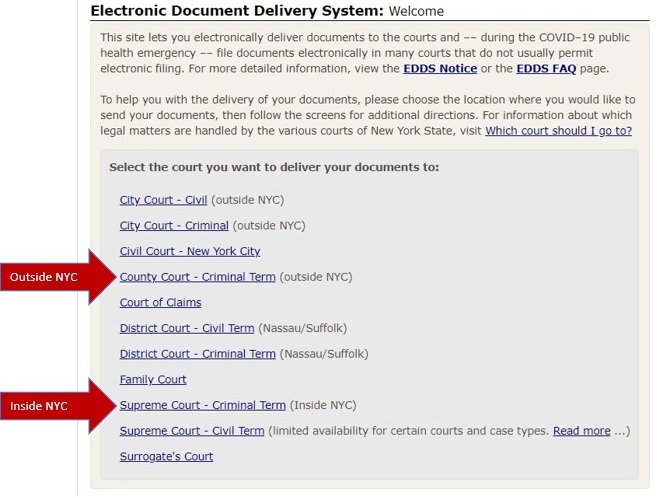 Criminal case types and document types authorized for EDDS submission may vary from week to week and from one court or judicial district to the next. If you are unsure whether your documents are authorized for submission via EDDS, contact the applicable Court or Judicial District Office to confirm before submitting. To find court contact information, use the Court Locator on the Unified Court System's public webpage, choose the county and court type from the drop-down menus, and then click the Find the Court button.