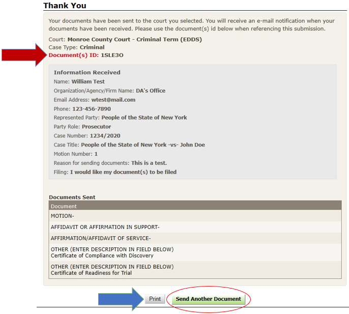 NOTE: You may need to reference your Document ID in future communications with the court. It is strongly