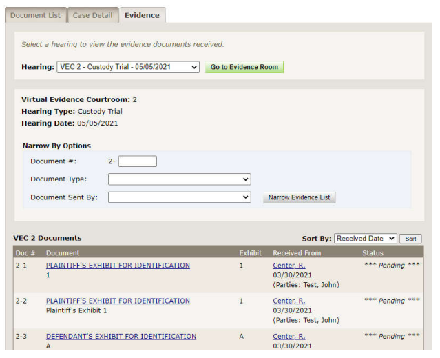 Once you are in the evidence courtroom you will have the ability to view documents that were submitted. You will have the ability to sort the documents as well. The status column will indicate if the document is pending, purged, returned, or admitted into evidence by the Judge.