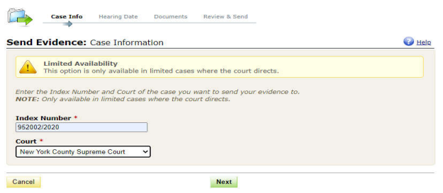 After clicking the Send Evidence link, you will be prompted to enter the index number of your case and to select the court.