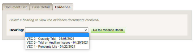 Once you click the evidence tab, you’ll be prompted to select the evidence/hearing you wish to view. Select the hearing which is identified by Virtual Evidence Courtroom number, hearing type, and date. (VEC # - Type- Date), then click on the "Go to Evidence Room" button.